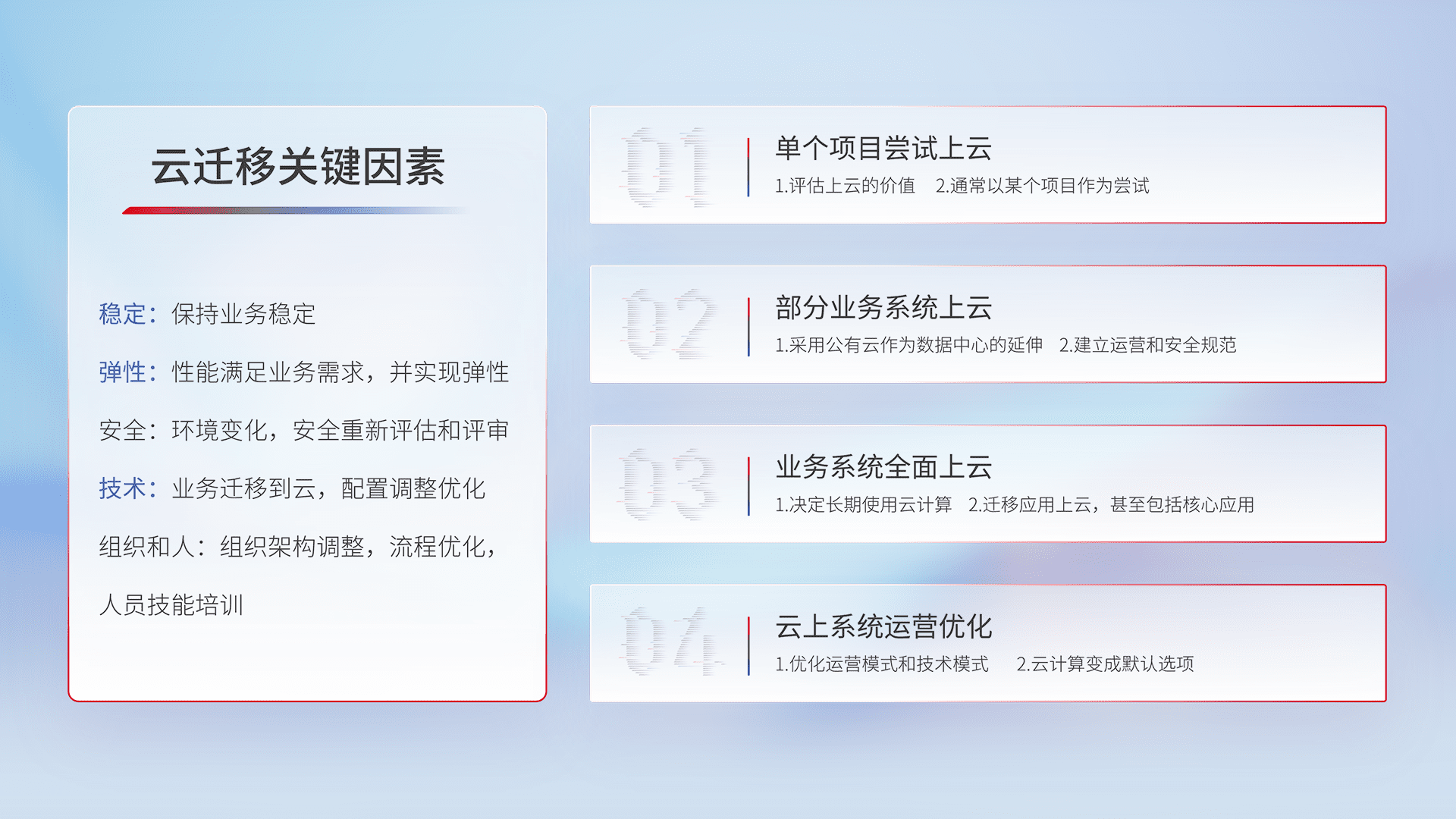 结合实际业务,,,,从规划设计、、、云平台选型、、云原生改造、、、、数据迁移、、集成交付,,,,迁移全过程为客户识别最佳上云路径,,,,做好风险识别管理,,,,设计网络架构、、、身份权限、、、、安全审计合规、、、、操作审计、、、、日志审计、、、监控告警策略、、多站点容灾设计等,,对云上基础设施进行整体规划,,提升IT治理水平,,,以满足弹性、、高可用、、、高性能的需求。。