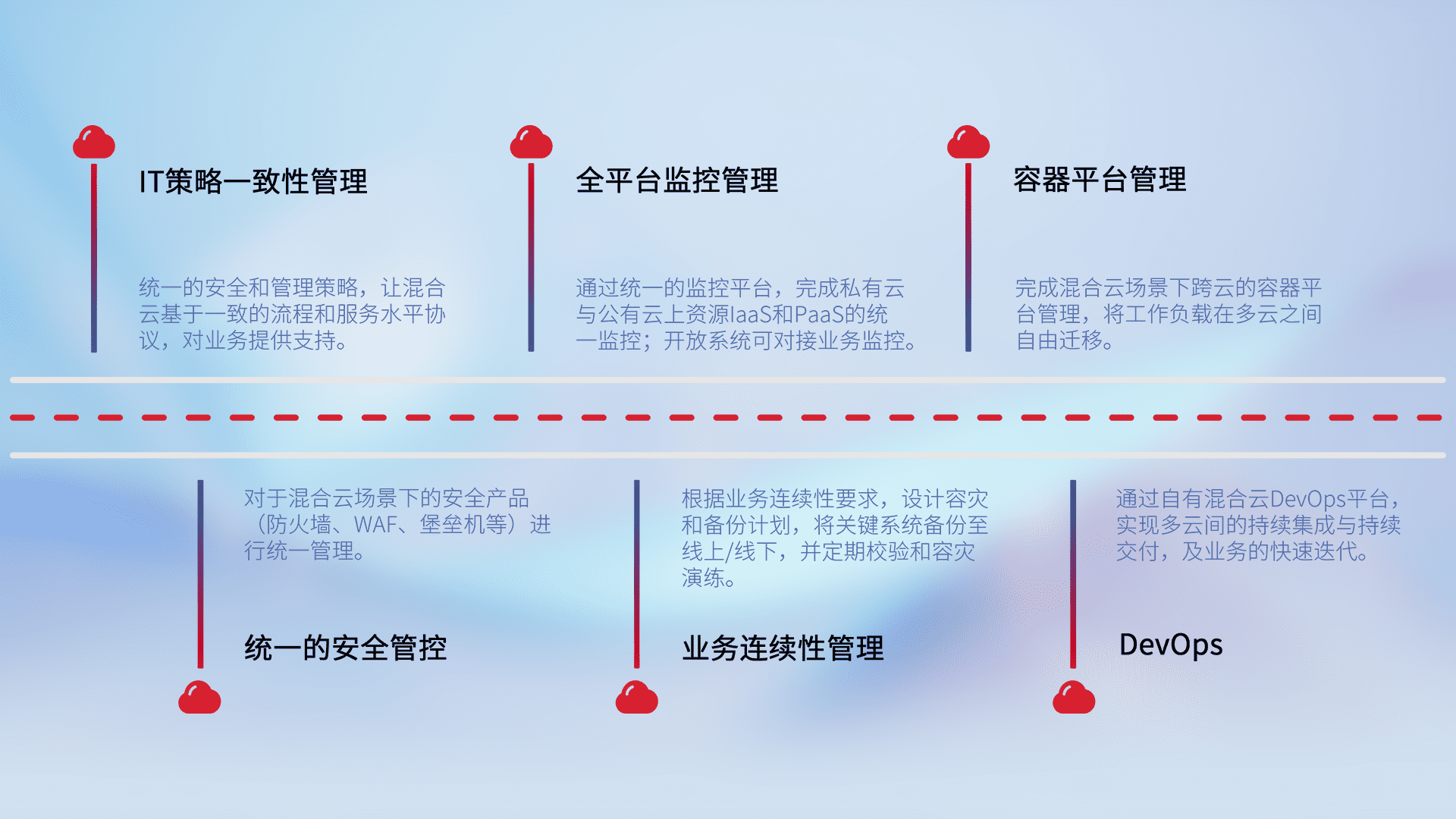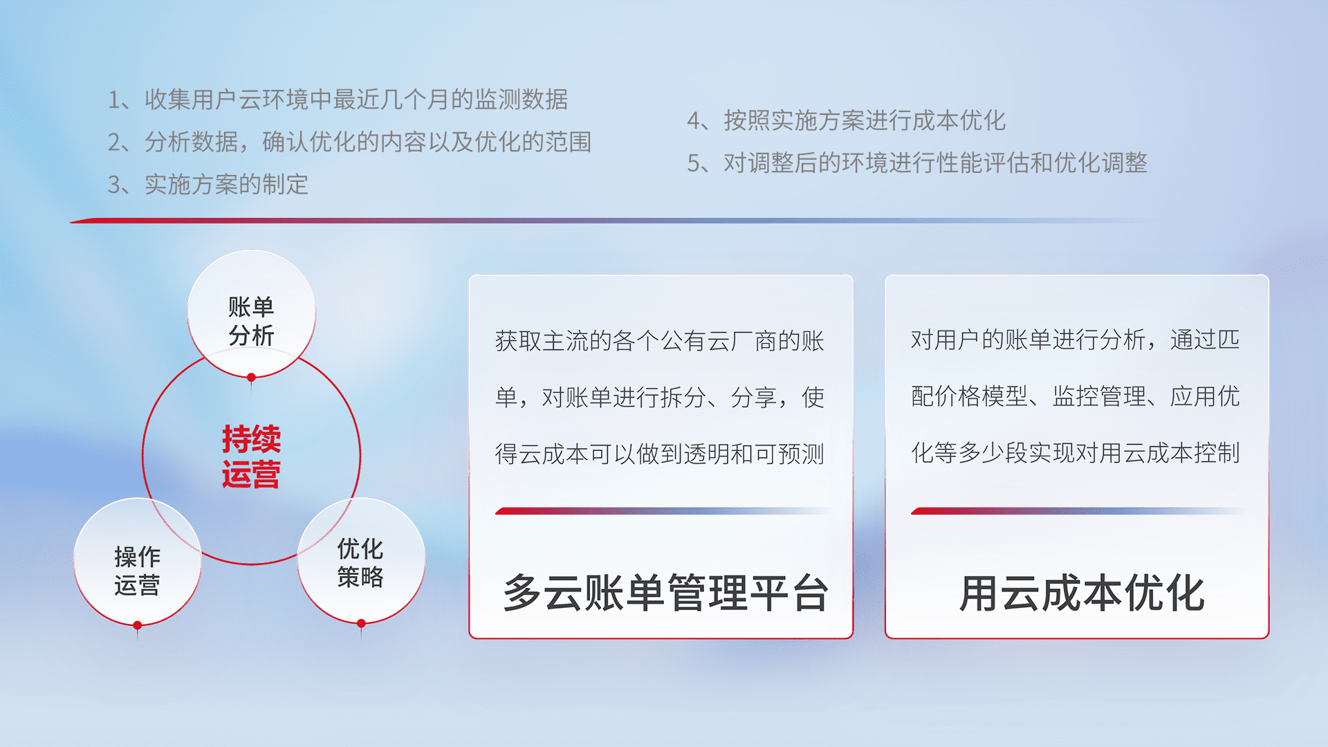 通过多云纳管,,以统一的资源数据模型把客户的云资源进行抽象和封装,,,进而实现对多云资源的统一操作,,,,保障云资源管理的可靠性、、、、稳定性与可用性。。。。量身定制化运维内容,,,配置、、、开发运维、、、补丁管理、、、备份、、监控、、、认证和访问管理、、、审计和日常巡检等,,保障在用云过程中的可靠度,,,稳定度以及高可用率。。