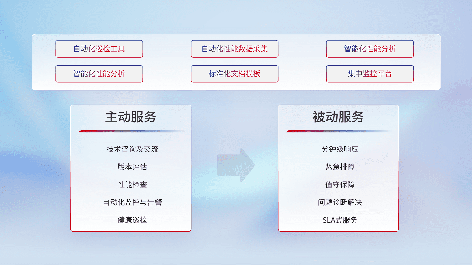 智能化工具和标准化文档,,,保障服务质量,,,提供主动服务(包含技术咨询、、、版本评估、、、、性能检查、、自动化监控与告警、、健康巡检)和被动服务包含(分钟级响应、、、紧急排障、、、、值守保障、、、问题诊断解决、、、SLA服务)。。。